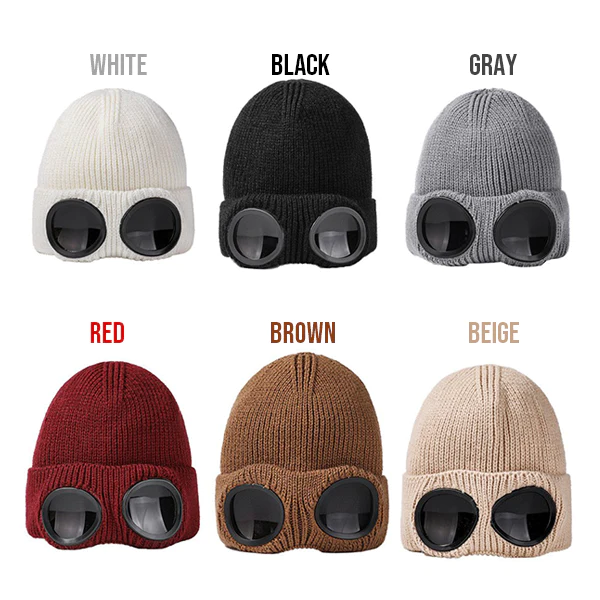A trendy close fitting beanie that comes with a built-in classic, chic-looking aviator lenses that rest casually just near the bottom of the bonnet. Making your standard winter hat more fashionable and unique which would surely make you stand out from the rest. It can be worn normally like any other beanie or be lowered down to use the lenses when doing cool, retro photoshoots and such. No need to wear an individual bonnet and eyewear anymore to style out your overall outfit.