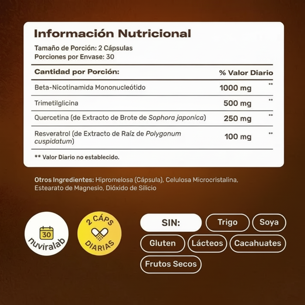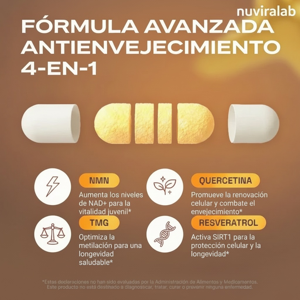 Formula 4-in-1 Completa: NMN, Resveratrolo, Quercetina e TMG in un unico prodotto.