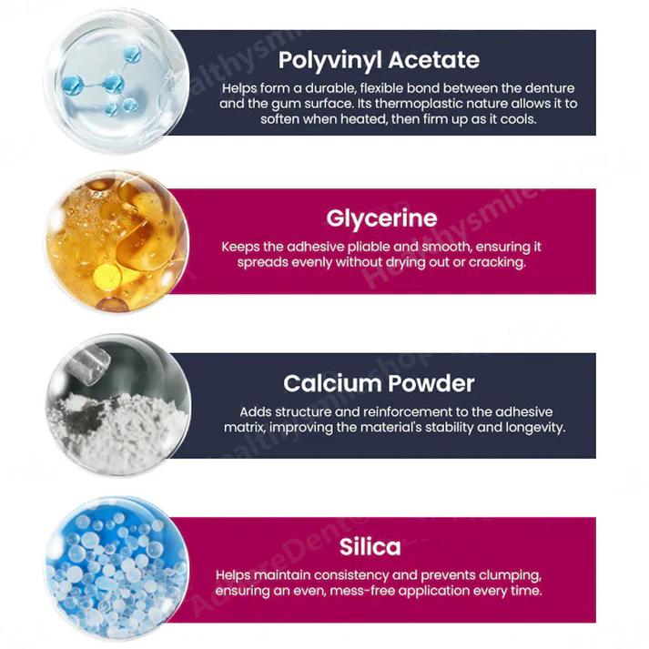 When exposed to warm water or body temperature, the adhesive softens and molds smoothly along the denture and gum surface, helping fill small gaps and improve overall contact.