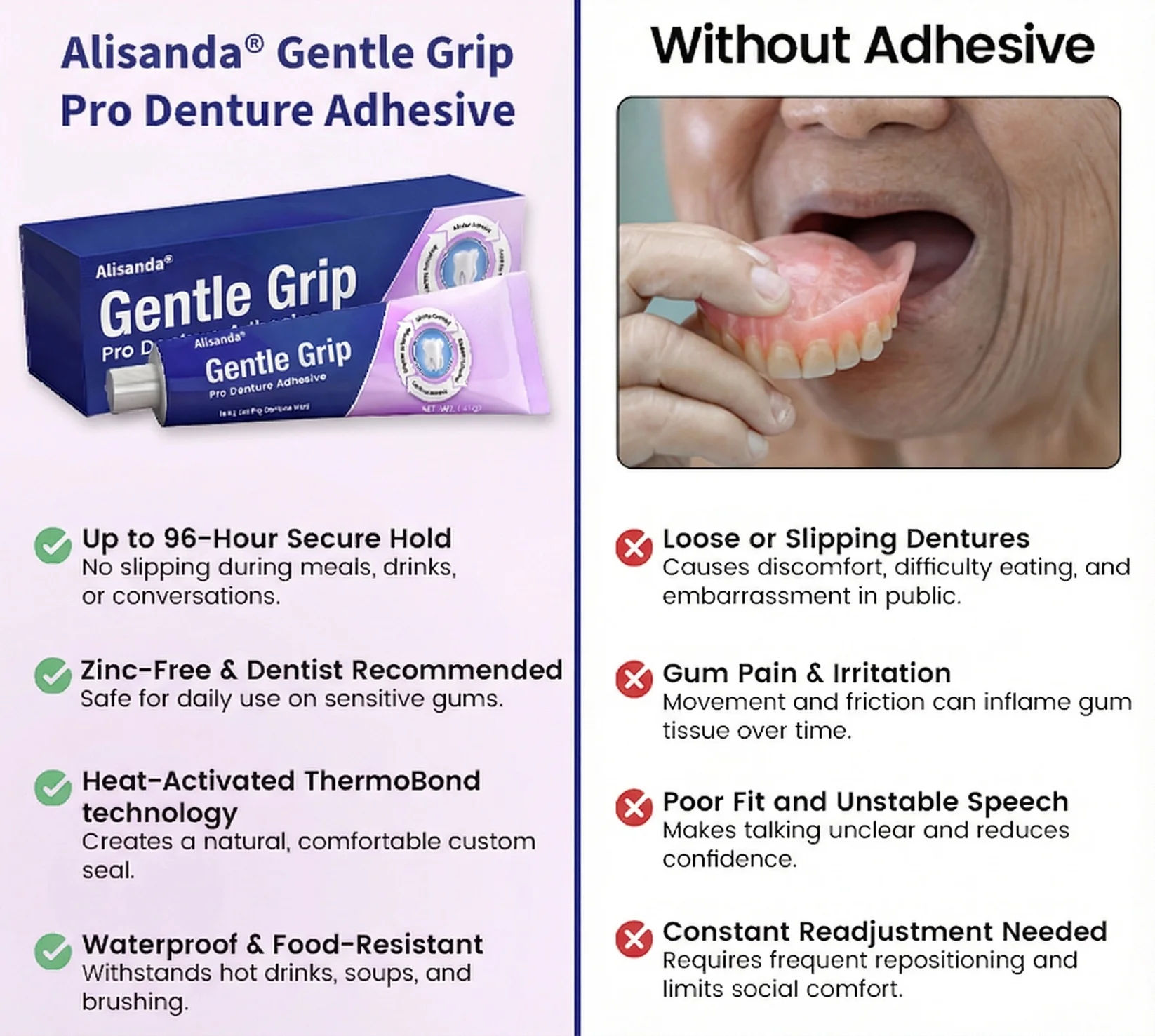 Stop letting loose dentures dictate your lifestyle. Whether it’s a juicy steak or a heartfelt laugh, you deserve a smile that stays exactly where it belongs. Alisanda® Denture Adhesive is a revolutionary, next-generation solution powered by Heat-Activated Technology. It creates a personalized, waterproof seal that molds perfectly to your unique gum shape, providing up to 96 hours of slip-free stability with just one application. Say goodbye to messy daily pastes and toxic chemicals—reclaim the confidence to eat, talk, and laugh freely again.