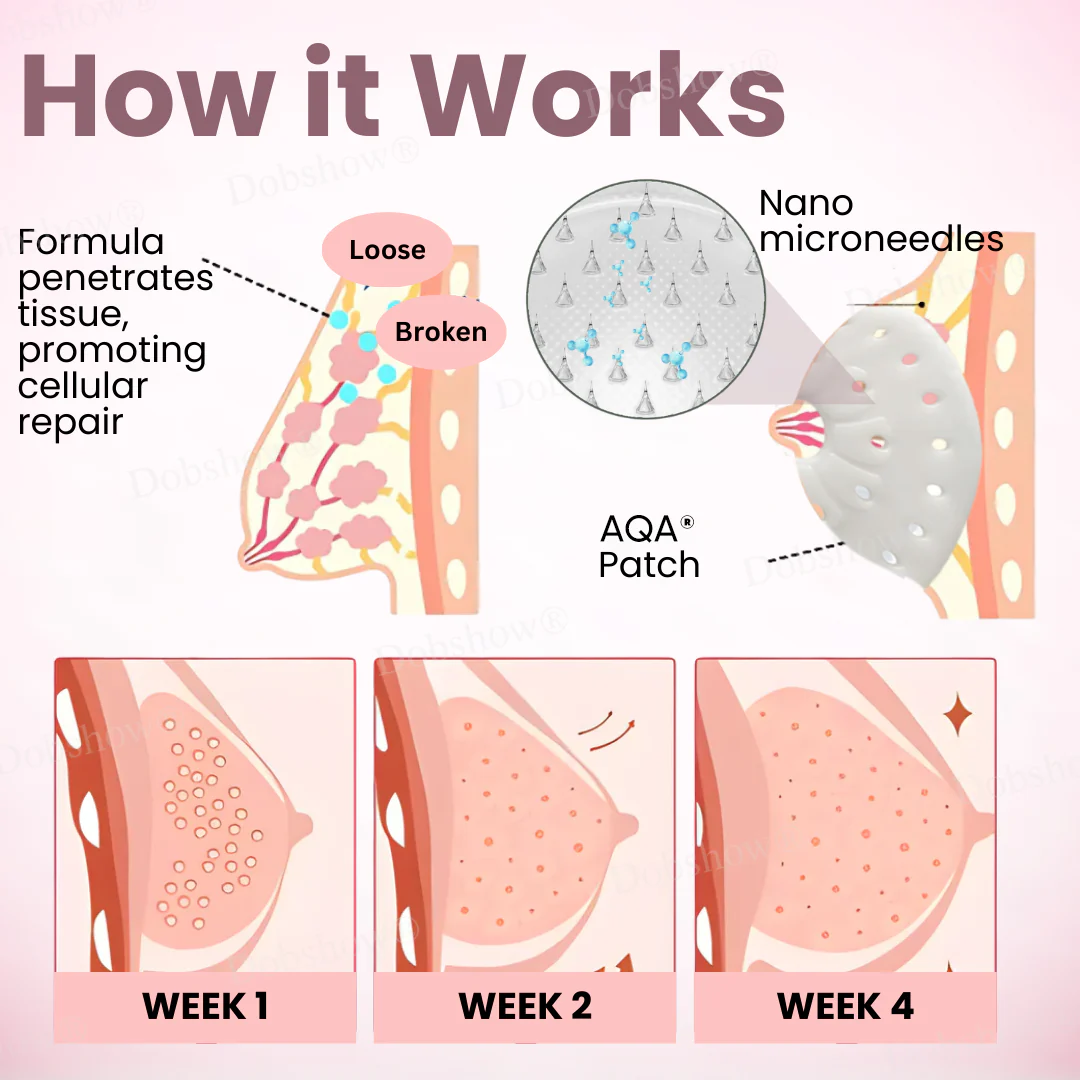 Experience the breakthrough in natural body sculpting. The AQA® Breast Enhancement Nano Patch is a revolutionary, non-invasive solution designed for women seeking to restore fullness, firmness, and lift. Whether due to aging, weight loss, or genetics, sagging and loss of volume can impact confidence. AQA® solves this using advanced Nano Microneedle Technology—hundreds of ultra-fine, 0.27mm dissolvable needles that create painless micro-channels to deliver potent botanical extracts deep beneath the skin’s surface. Unlike standard creams, AQA® ensures maximum absorption, stimulating collagen and tissue regeneration for a naturally rounder, firmer, and more youthful silhouette in just weeks.
