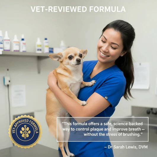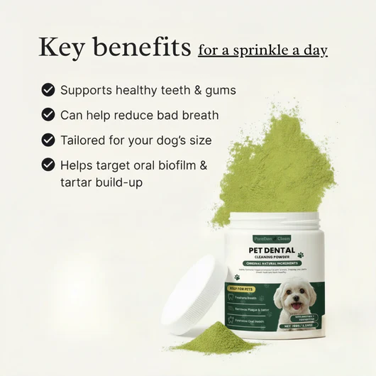 BrightBite™ Dental Powder is a daily pet oral-care supplement designed to support fresh breath, cleaner-looking teeth, and overall mouth comfort — simply by sprinkling it on food.