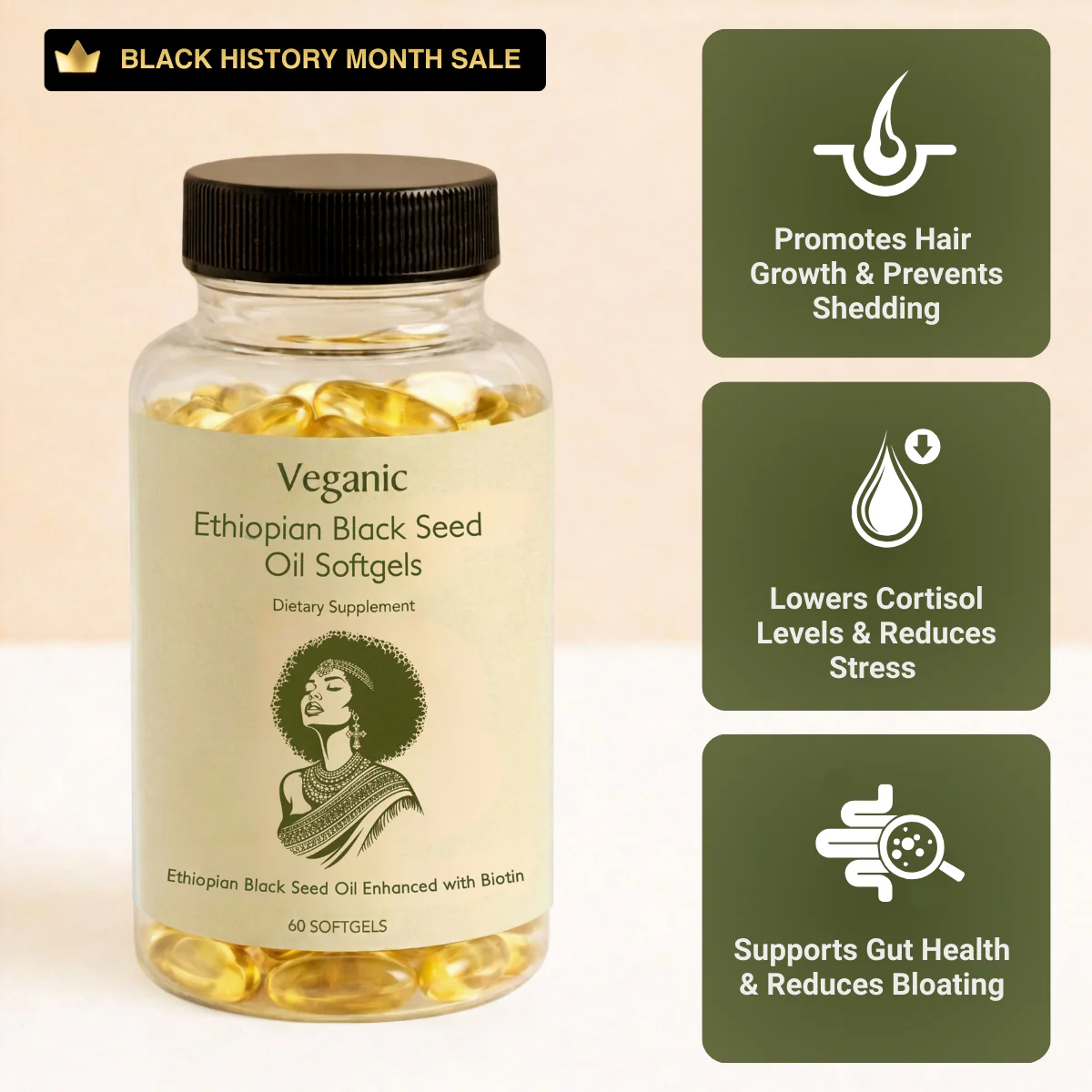 Don’t settle for average supplements. Veganic® Ethiopian Black Seed Oil is extracted using traditional tribal methods to ensure it is at least 5 times more potent than any other black seed oil on the market. Packed with clinically studied compounds and verified Thymoquinone levels, these softgels target the root causes of hair thinning, high cortisol (stress), and gut inflammation. Within just 2 weeks, experience a transformation that starts from the inside out—stronger hair, a calmer mind, and a lighter, healthier body.