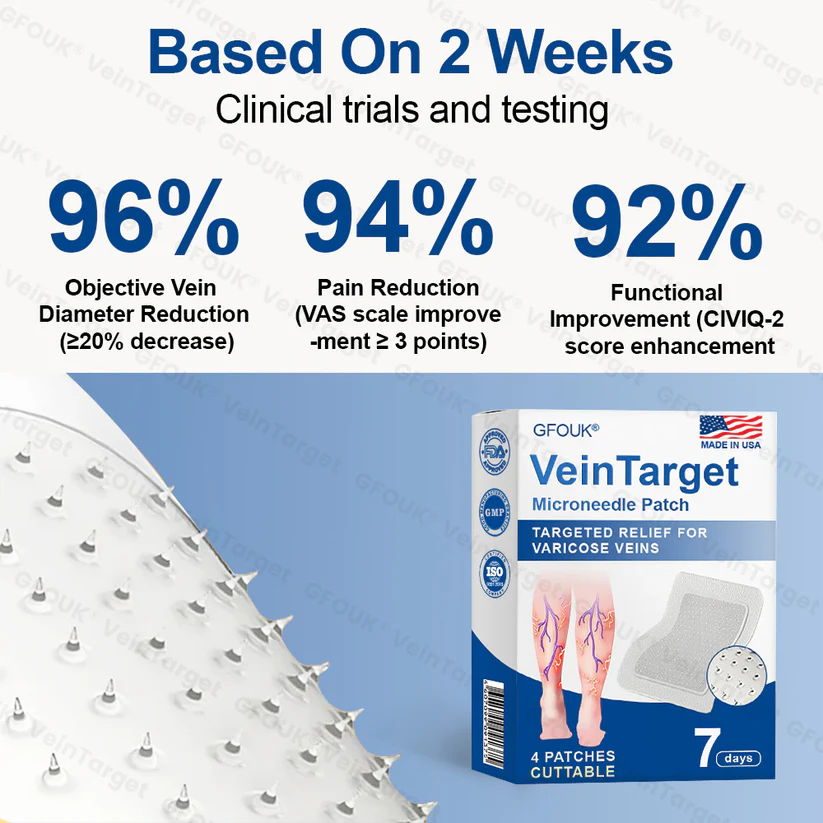 GFOUK® VeinTarget is the first FDA-registered, GMP-certified Alpine herbal microneedle patch with a clinically proven 96% success rate in treating chronic venous insufficiency at home. Its breakthrough transdermal delivery system penetrates 100x deeper than topical creams and delivers visible vein reduction in just 7–14 days. Skip the costly surgical procedures and restore healthy circulation naturally – all from the comfort of your home.