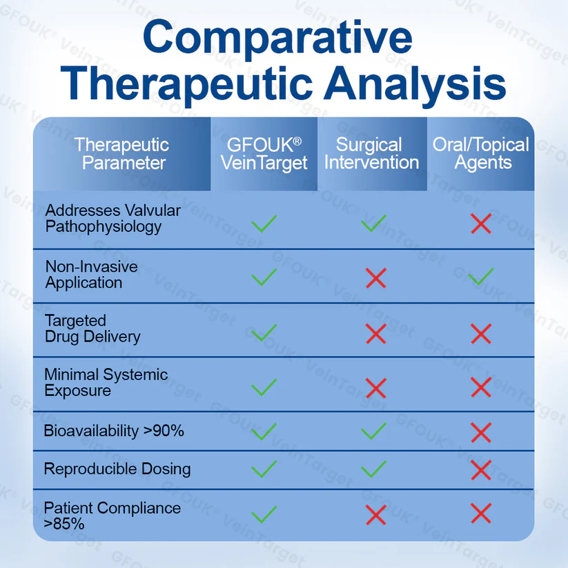 GFOUK® VeinTarget represents the first commercially available transdermal phytotherapy system specifically designed to address venous valvular insufficiency through localized botanical intervention. Unlike systemic treatments that dilute active compounds throughout the circulatory system or topical applications that cannot penetrate the dermal barrier, our microneedle delivery system ensures concentrated therapeutic compounds reach the target tissue with minimal systemic exposure.