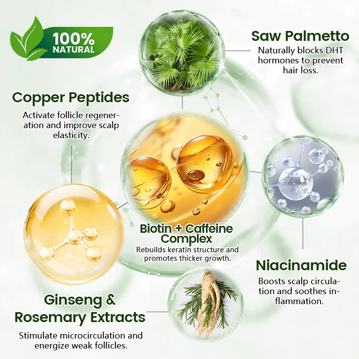 Clinically tested and FDA-compliant, Lovilds® Follicure uses a peptide-based BioRestore system to reactivate dormant follicles, block DHT, and restore healthy hair growth from the root. Visible improvement can be seen in 2–4 weeks—reduced shedding, thicker strands, and revitalized scalp circulation. Powered by Copper Peptides, Saw Palmetto, Niacinamide, Biotin + Caffeine, and Ginseng Extracts, this advanced formula penetrates deeply through a Nano-Absorb spray system, ensuring fast absorption without residue or irritation. A new generation of non-invasive, drug-free follicle therapy—scientifically designed for stronger, fuller, healthier hair.