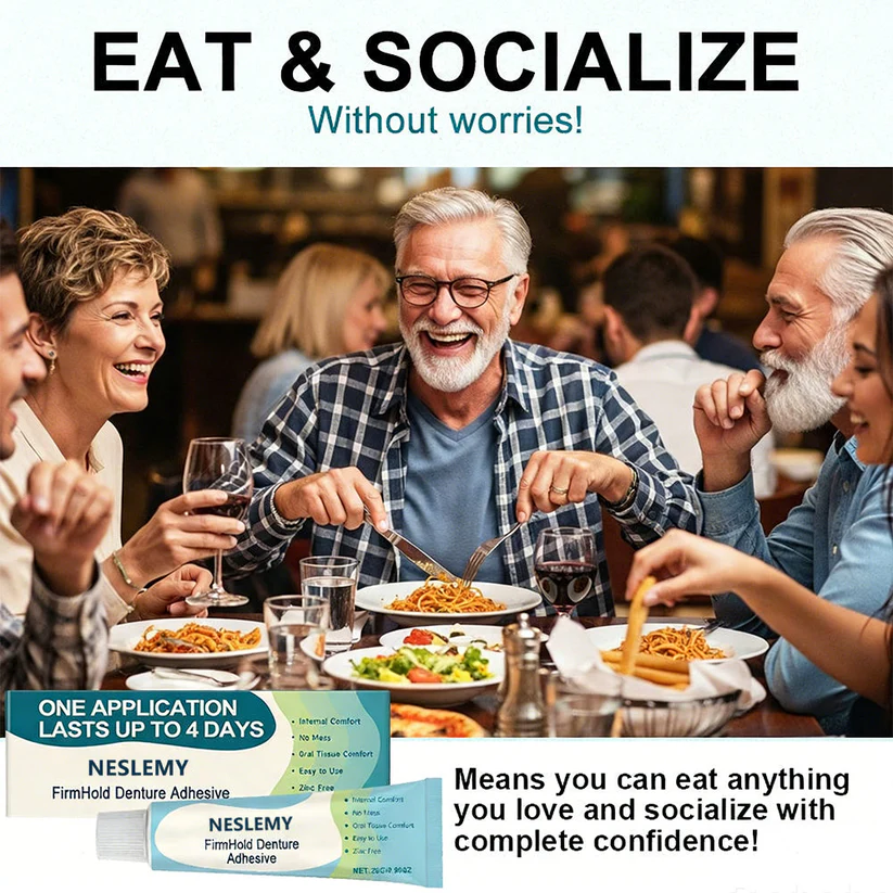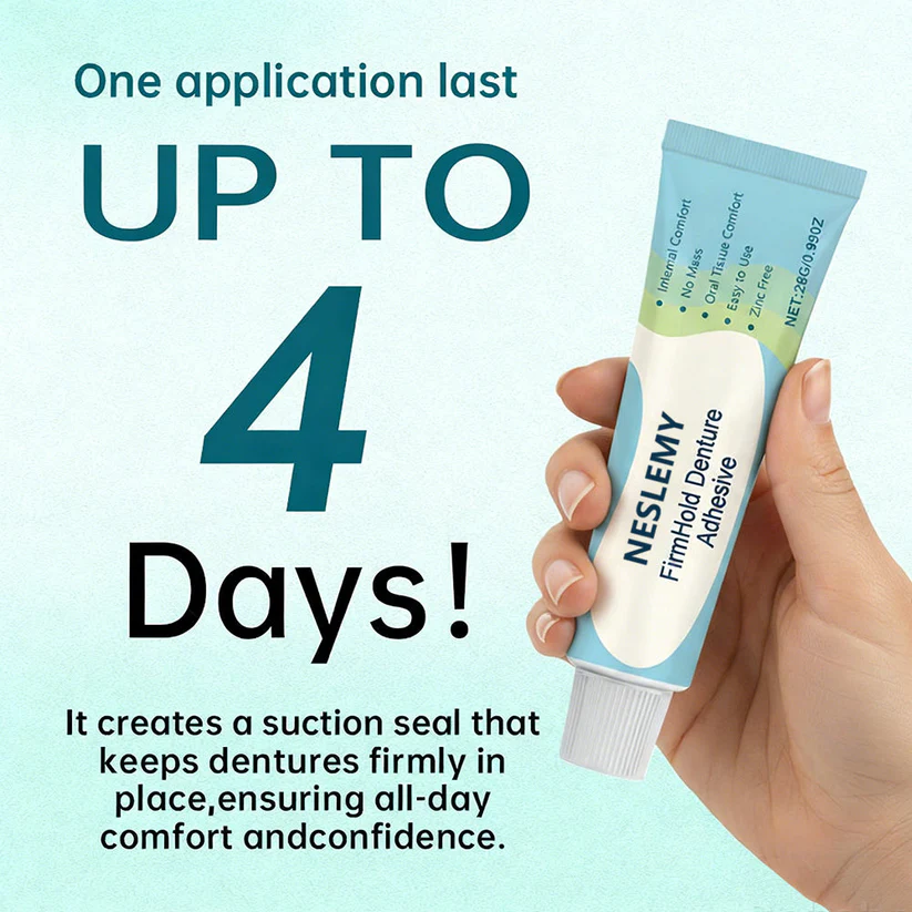 If slipping dentures, messy pastes, and constant reapplication have been part of your daily routine, NESLEMY® FirmHold is designed to change that. This next-generation denture adhesive uses heat-adaptive technology to form a secure, personalized bond that helps dentures stay comfortably in place for up to 4 days — without daily re-application, sticky residue, or irritation.