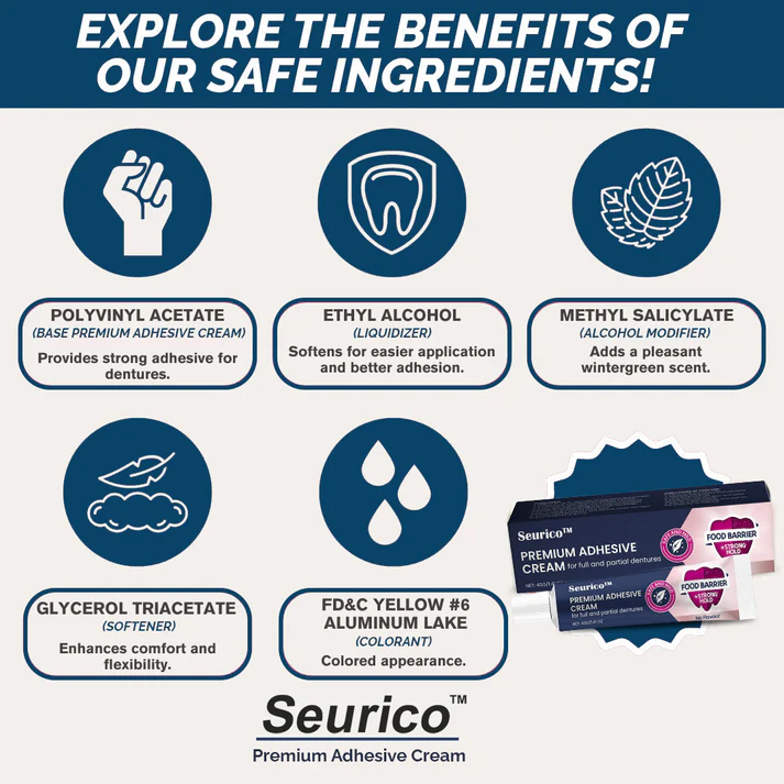 Improve your denture experience with ✨[Official Brand Store] 😁Seurico™ Premium Adhesive Cream🦷 (✨BUY 3, GET 2 FREE🎁)! Say goodbye to the discomfort of ill-fitting dentures. Don’t let shifting dentures stop you from enjoying your everyday life. Our adhesive cream provides a strong and comfortable bond, promotes oral hygiene, and gives you the confidence to smile freely. Ideal for treating problems such as pressure sores and inflammation, our Seurico thermoplastic denture adhesive is a must-have for anyone looking for a secure and comfortable fit.